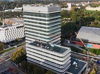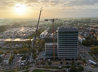 The approximately 57-metre-high building on the former parking lot area will be home to the headquarters of Volksbank Raiffeisenbank Bayern Mitte eG, and half of the almost 15,000 square meters of office and commercial space will be rented to external tenants.
